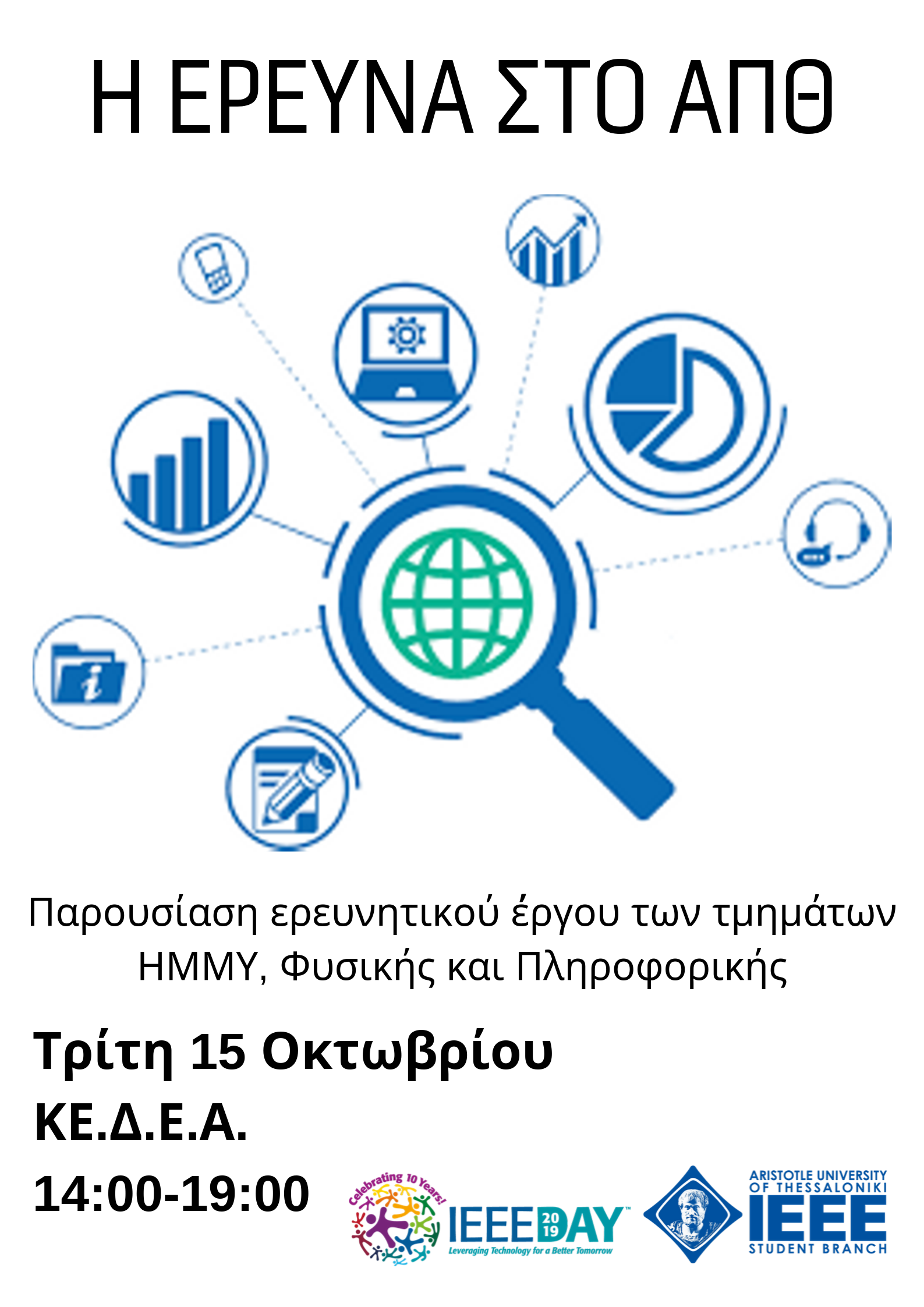 Με στόχο την ανάδειξη του σπουδαίου ερευνητικού έργου που πραγματοποιείται στο Αριστοτέλειο Πανεπιστήμιο Θεσσαλονίκης, η φοιτητική ομάδα IEEE AUTH Student Branch διοργανώνει ημερίδα με τίτλο «Η Έρευνα στο ΑΠΘ», η οποία θα πραγματοποιηθεί την Τρίτη  15 Οκτωβρίου 2019, στις 14:00, στο ΚΕΔΕΑ του ΑΠΘ (Αμφιθέατρο Ι – ισόγειο).
