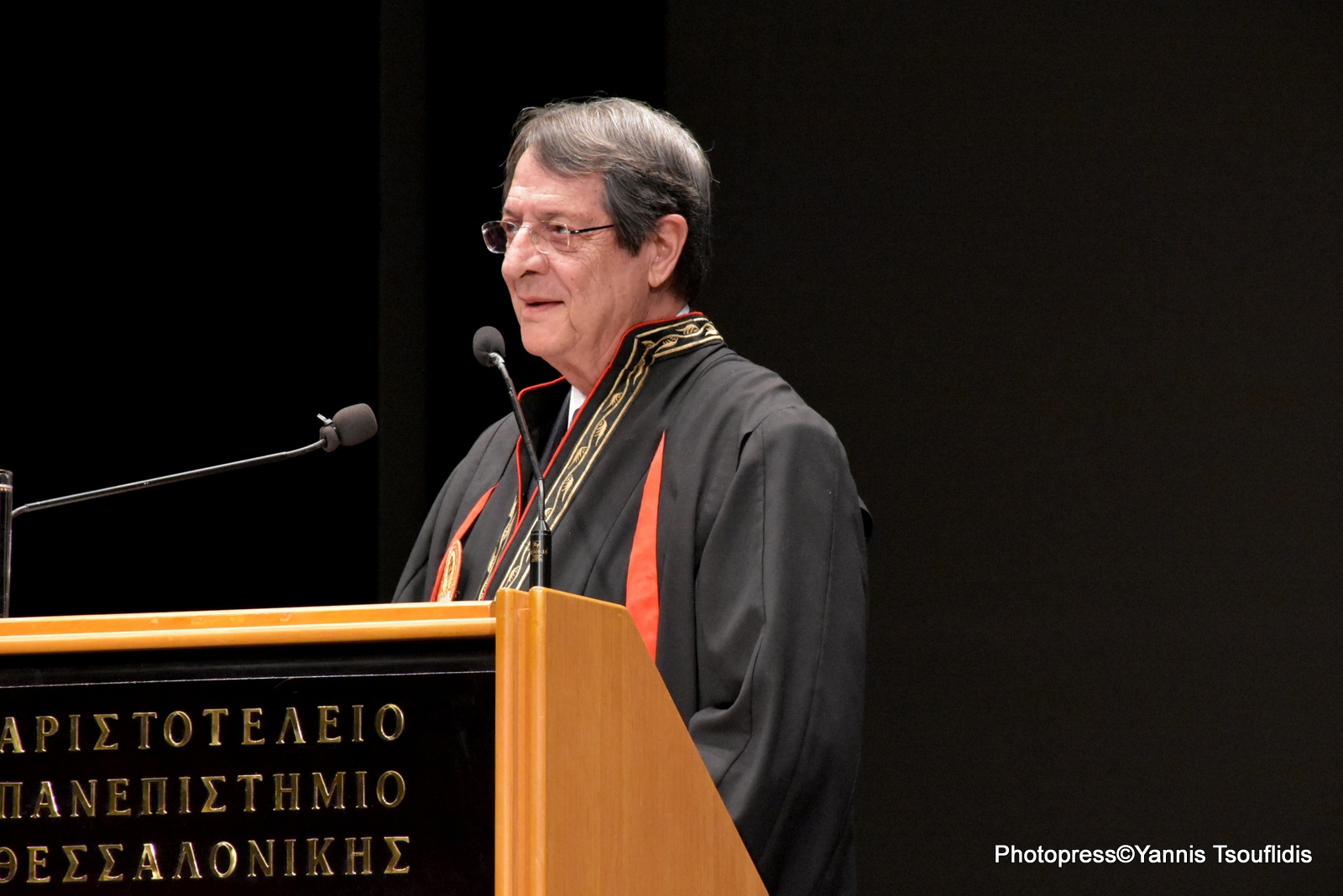 Ο Πρόεδρος της Κυπριακής Δημοκρατίας, Νίκος Αναστασιάδης, ξεκίνησε την ομιλία του ευχαριστώντας το Αριστοτέλειο Πανεπιστήμιο για την τιμή που του αποδίδει. «Δεχθείτε παρακαλώ», είπε απευθυνόμενος προς τις Πρυτανικές Αρχές «τις ευγνώμονες ευχαριστίες του ιδίου αλλά και του Κυπριακού Ελληνισμού, προς τους οποίους και οφείλω τη σημερινή ύψιστη τιμή. Την αποδέχομαι ως τη διά του προσώπου μου αναγνώριση των πολυετών αγώνων του Κυπριακού Ελληνισμού για ελευθερία και δικαίωση. Ταυτόχρονα, το σκεπτικό της αποφάσεώς σας δεν απονέμει μόνον επαίνους και τιμή, αλλά υπαγορεύει και την εμμονή μου εις την επιτέλεση του προς την ιδιαίτερή μου πατρίδα χρέους. Θέλω να σας διαβεβαιώσω πως αυτό το χρέος, αυτό το όραμα, επιδιώκω να επιτύχω μέσα από τη ζεύξη του τι οι κανόνες δίκαιου επιτάσσουν και τι ο πολιτικός ρεαλισμός υπαγορεύει. Η αναγόρευσή μου ως Επίτιμου Διδάκτορα της Νομικής Σχολής του Αριστοτέλειου Πανεπιστημίου Θεσσαλονίκης θεωρώ πως ανταποκρίνεται και συμβαδίζει με το διαχρονικά αποδεδειγμένο ενδιαφέρον σας για την τύχη του Ελληνισμού της Κύπρου», είπε ο Τιμώμενος.