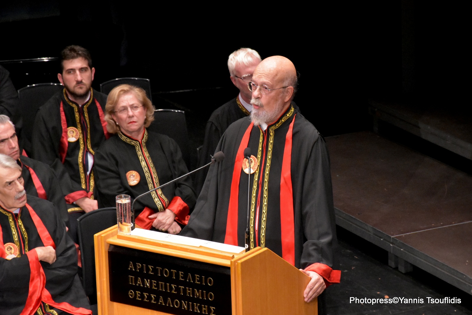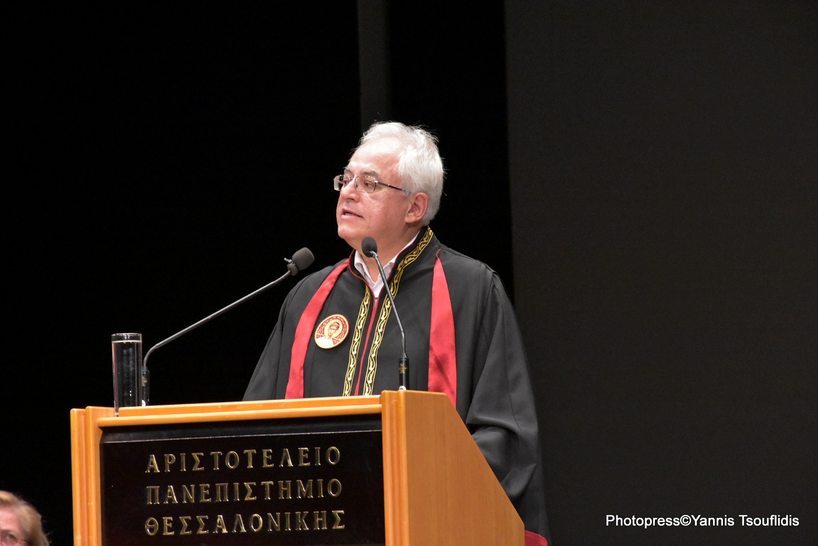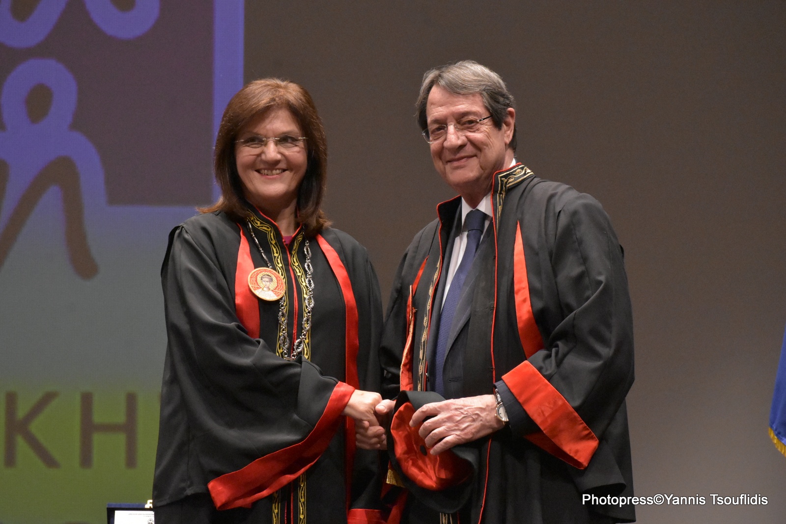 «Κύριε Πρόεδρε, σε χρόνο που ουδείς ανέμενε, όχι απλώς ανορθώσατε, αλλά ισχυροποιήσατε έτι περαιτέρω την Κύπρο στο διεθνές οικονομικό και πολιτικό στερέωμα. Ενάντια στις τρέχουσες αναχρονιστικές αντιλήψεις, τολμάτε να προχωράτε μπροστά και να στοχεύετε στο μέλλον. Με σταθερή προσήλωση στην Παιδεία και την πλήρη στήριξη των παραγωγικών δυνάμεων  της χώρας σας, οδηγήσατε το καράβι σας και κατορθώσατε την τόσο ταχεία αντιμετώπιση της κρίσης […] Δεδομένης της σημαίνουσας, αλλά και συνάμα ταραχώδους γεωγραφικής και γεωπολιτικής θέσης της χώρας σας, επιτύχατε την απαιτούμενη εκείνη ψυχραιμία που ορίζουν οι, συχνά, “θερμές” εξελίξεις. Ενσκήψατε με σεβασμό και κατανόηση στα συναισθήματα ενός ολόκληρου λαού και προκρίνατε τη λύση του διαλόγου και των διαπραγματεύσεων, έναντι μιας άγονης πολεμικής και εμπρηστικής ρητορικής», ανέφερε χαρακτηριστικά ο Πρύτανης του ΑΠΘ.