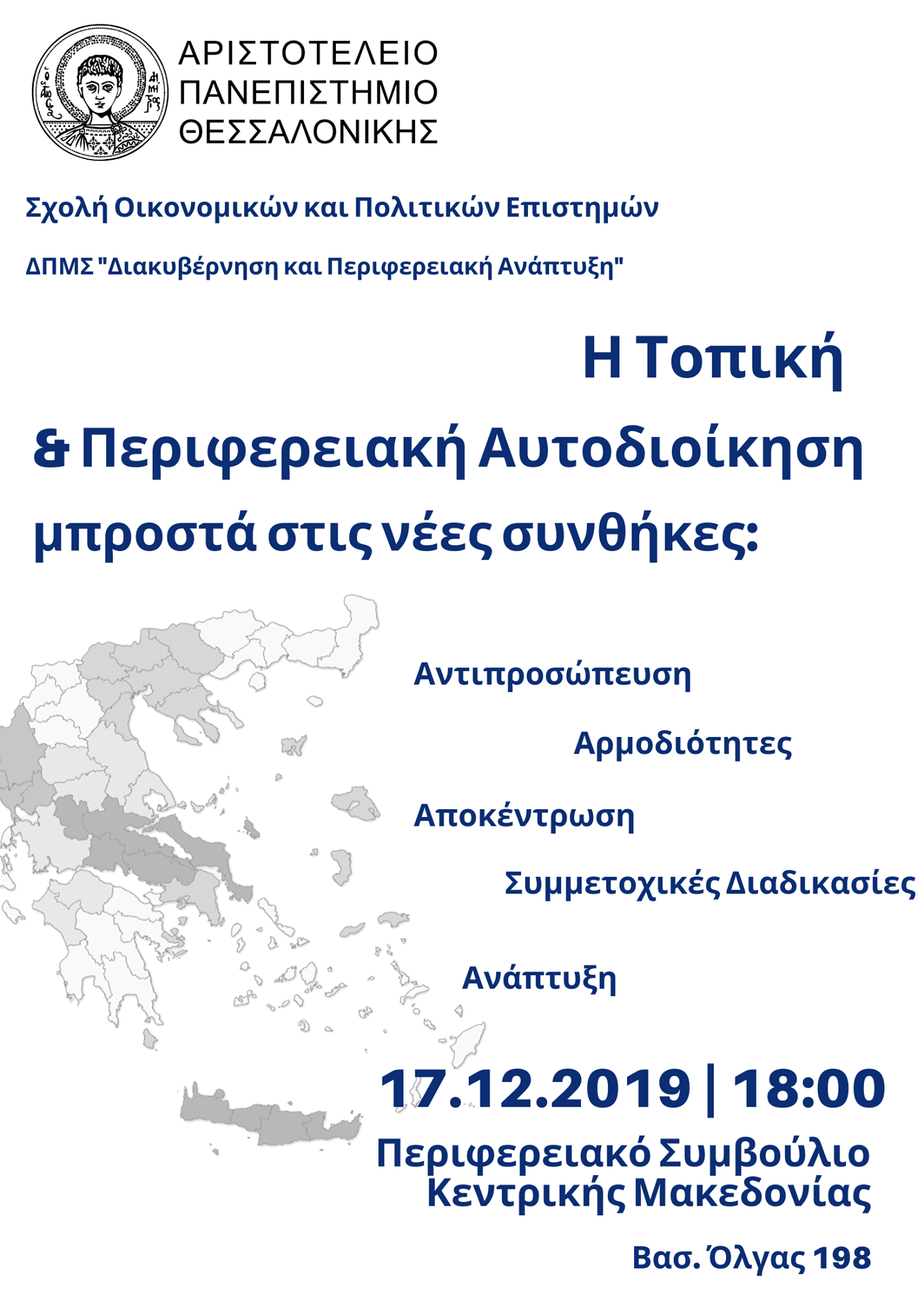 Το Διατμηματικό Μεταπτυχιακό Πρόγραμμα Σπουδών των Τμημάτων Πολιτικών και Οικονομικών Επιστημών του ΑΠΘ «Διακυβέρνηση-Περιφερειακή Ανάπτυξη», υπό την αιγίδα της Σχολής Οικονομικών και Πολιτικών Επιστημών και της Νομικής Σχολής του ΑΠΘ διοργανώνει την εκδήλωση με τίτλο «Η Τοπική και Περιφερειακή Αυτοδιοίκηση μπροστά στις νέες συνθήκες: Αντιπροσώπευση, Αρμοδιότητες, Αποκέντρωση, Συμμετοχικές Διαδικασίες, Ανάπτυξη», η οποία θα λάβει χώρα την Τρίτη 17 Δεκεμβρίου 2019 και ώρα 18:00, στην Αίθουσα του Περιφερειακού Συμβουλίου Κεντρικής Μακεδονίας (Βασ. Όλγας 198).