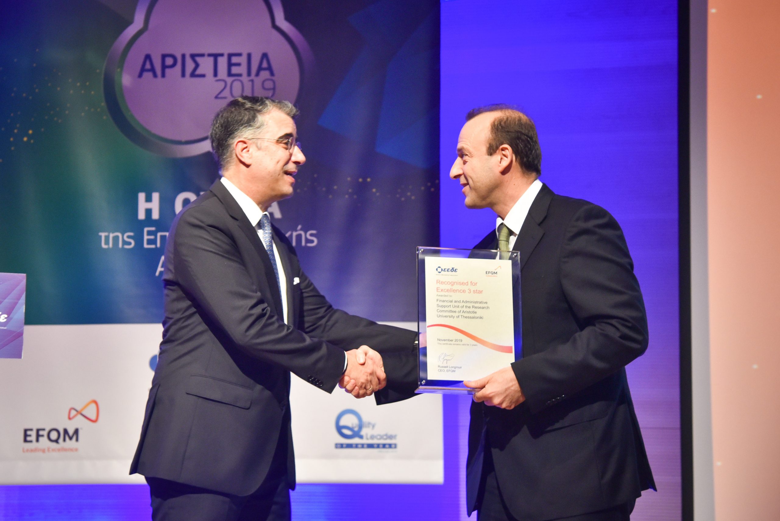 Η Μονάδα Οικονομικής & Διοικητικής Υποστήριξης του Ειδικού Λογαριασμού Κονδυλίων Έρευνας (ΜΟΔΥ ΕΛΚΕ) του Αριστοτέλειου Πανεπιστημίου Θεσσαλονίκης βραβεύθηκε στις 12 Δεκεμβρίου 2019, στη Μεγάλη Γιορτή της Επιχειρηματικής Αριστείας, ΑΡΙΣΤΕΙΑ 2019, η οποία διοργανώνεται κάθε χρόνο από την Ελληνική Εταιρία Διοικήσεως Επιχειρήσεων (ΕΕΔΕ). Αποτελεί δε τον πρώτο Ειδικό Λογαριασμό που διακρίνεται στο πρόγραμμα των Επιπέδων Αριστείας (EFQM Excellence Award), λαμβάνοντας τη Διεθνή Πιστοποίηση «Recognised for Excellence 3 Star».