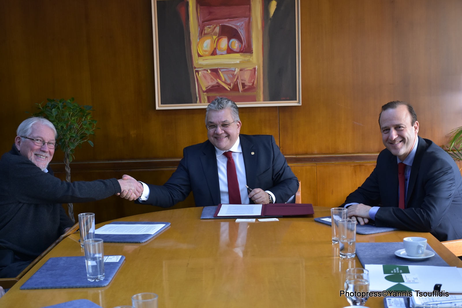 Φωτογραφία: Ο Πρύτανης του ΑΠΘ, Καθηγητής Νικόλαος Γ. Παπαϊωάννου (κέντρο), ο Αντιπρύτανης Έρευνας και Διά Βίου Εκπαίδευσης του ΑΠΘ, Αν. Καθηγητής Ευστράτιος Στυλιανίδης (δεξιά), και ο Δρ. Robert M. Goodman, Επικεφαλής Ερευνητής του Προγράμματος.