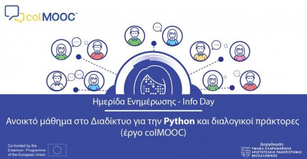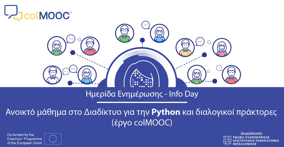 Η ενημερωτική ημερίδα με θέμα «Ανοικτό μάθημα στο Διαδίκτυο για την Python και διαλογικοί πράκτορες» θα πραγματοποιηθεί την Παρασκευή 14 Φεβρουαρίου 2020, στις 10.30, στο ΚΕΔΕΑ του ΑΠΘ, στο πλαίσιο της συμμετοχής του Αριστοτελείου στο ευρωπαϊκά χρηματοδοτούμενο έργο colMOOC.