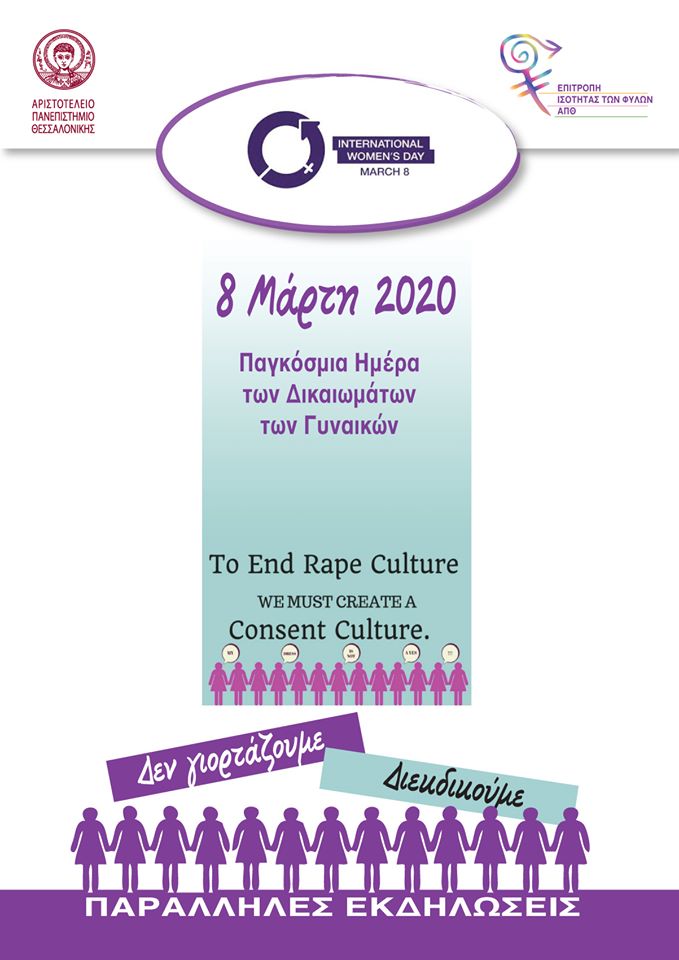 Οι εκδηλώσεις ξεκίνησαν στις 24 Φεβρουαρίου 2020 με το σεμινάριο «Μηδενική ανοχή στην κουλτούρα του βιασμού» στην Παιδαγωγική Σχολή του ΑΠΘ και θα κορυφωθούν τη Δευτέρα 9 Μαρτίου 2020 με την κεντρική εκδήλωση, με τίτλο «Όχι στην έμφυλη βία. Δεν συναινώ-αντιδρώ», η οποία τελεί υπό την αιγίδα των Πρυτανικών Αρχών του ΑΠΘ.