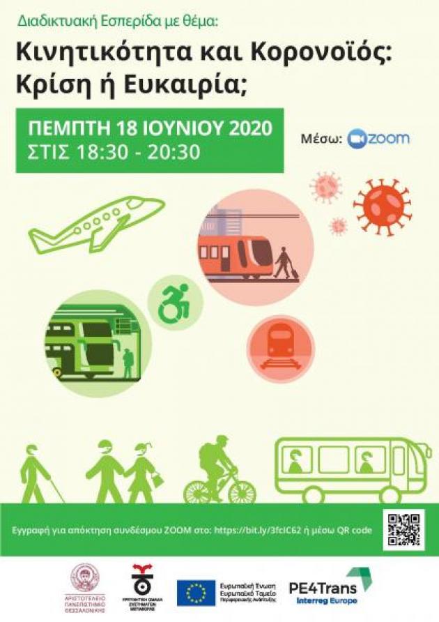 Διαδικτυακή εκδήλωση με θέμα «Κινητικότητα και Κορονοϊός: Κρίση ή Ευκαιρία;» διοργανώνει η Ερευνητική Ομάδα Συστημάτων Μεταφοράς του ΑΠΘ (ΕΟΣΜ/ΑΠΘ) την Πέμπτη 18 Ιουνίου 2020, στις 18.30-20.30, μέσω της πλατφόρμας τηλεδιασκέψεων ZOOM.
