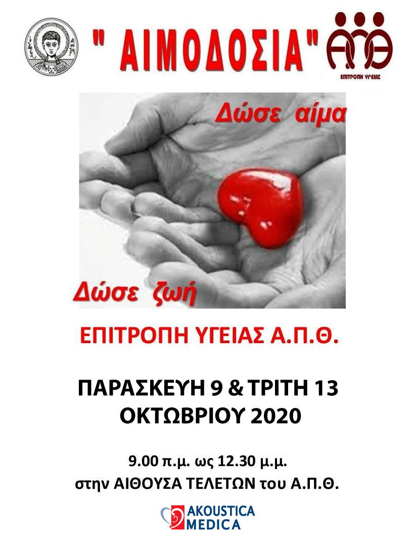 Η αιμοδοσία θα πραγματοποιηθεί την Παρασκευή 9 Οκτωβρίου και την Τρίτη 13 Οκτωβρίου 2020, από τις 9.00  έως τις 12.30, στην Αίθουσα Τελετών του ΑΠΘ.