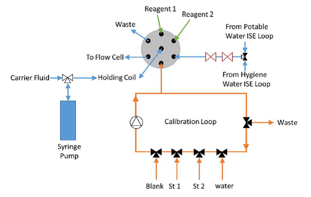 Εικόνες 3 και 4: Συνδεσμολογία λειτουργίας υβριδικού αναλυτή. ISE: εκλεκτικό ηλεκτρόδιο, μSIA: αναλυτής ροής διαδοχικής έγχυσης, DW: αποσταγμένο νερό, W1, W2: δοχεία συλλογής αποβλήτων R1, R2, R3:  δοχεία αντιδραστηρίων.