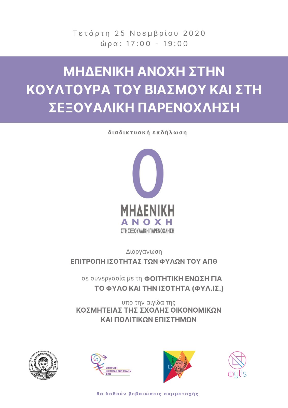 Η κεντρική εκδήλωση με τίτλο «Μηδενική ανοχή στην κουλτούρα του βιασμού και στη σεξουαλική παρενόχληση», που διοργανώνεται σε συνεργασία με τη Φοιτητική Ένωση για το Φύλο και την Ισότητα (ΦΥΛ.ΙΣ. ΑΠΘ) και τελεί υπό την αιγίδα της Κοσμητείας της Σχολής Οικονομικών και Πολιτικών Επιστημών (ΟΠΕ) του ΑΠΘ, θα πραγματοποιηθεί την Τετάρτη 25 Νοεμβρίου 2020, ενώ στις 26 και 27 Νοεμβρίου 2020 διοργανώνονται παράλληλες εκδηλώσεις σεμιναριακού τύπου.