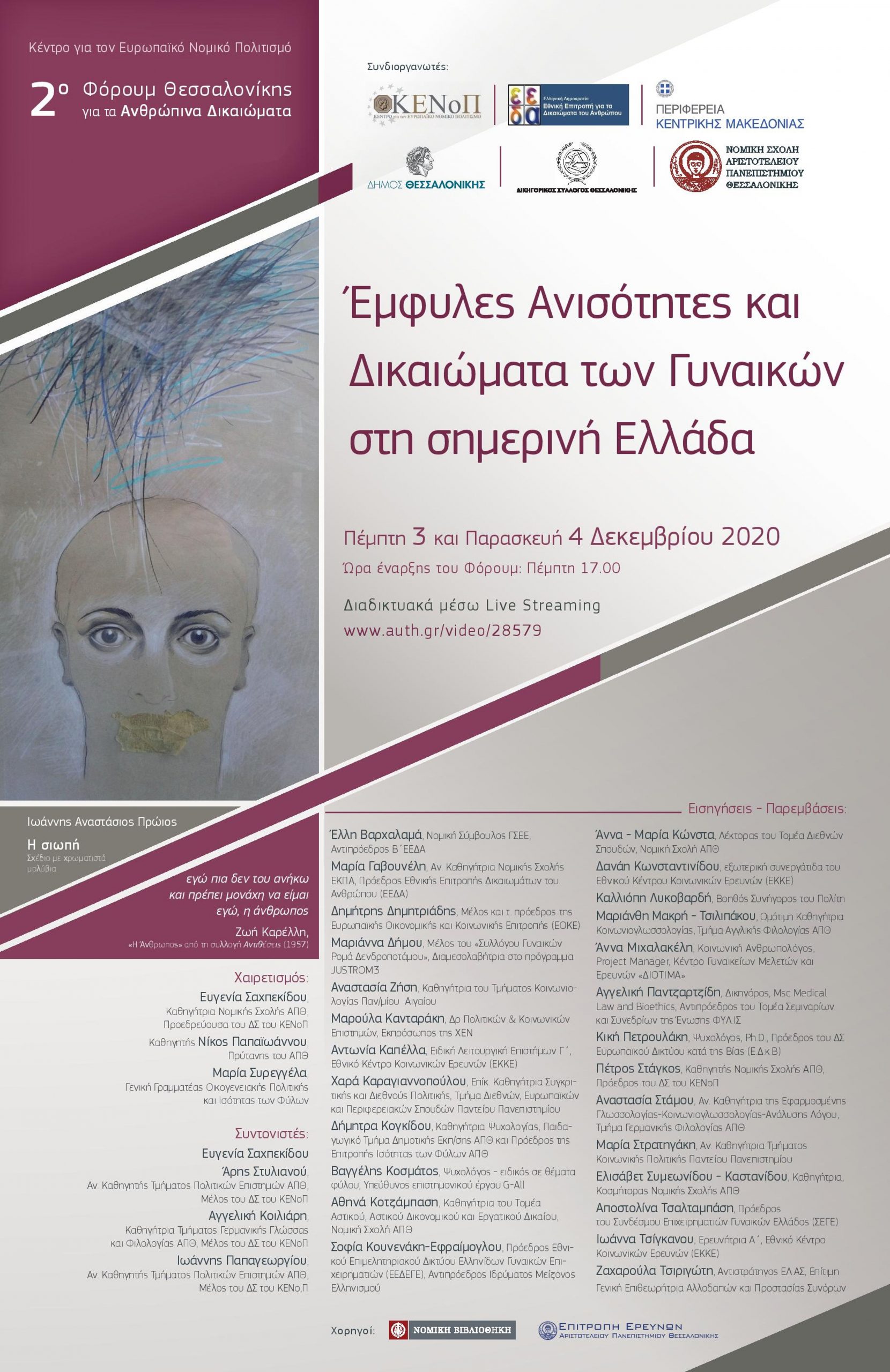 Το 2ο Φόρουμ Θεσσαλονίκης για τα Ανθρώπινα Δικαιώματα στην Ελλάδα και την Ευρώπη με θέμα «Έμφυλες Ανισότητες και Δικαιώματα των Γυναικών στη σημερινή Ελλάδα» διοργανώνεται από το Κέντρο για τον Ευρωπαϊκό Νομικό Πολιτισμό (ΚΕΝοΠ) του ΑΠΘ σε συνεργασία με την Εθνική Επιτροπή για τα Δικαιώματα του Ανθρώπου (ΕΕΔΑ), την Περιφέρεια Κεντρικής Μακεδονίας, τον Δήμο Θεσσαλονίκης, τη Νομική Σχολή του ΑΠΘ και τον Δικηγορικό Σύλλογο Θεσσαλονίκης (ΔΣΘ).