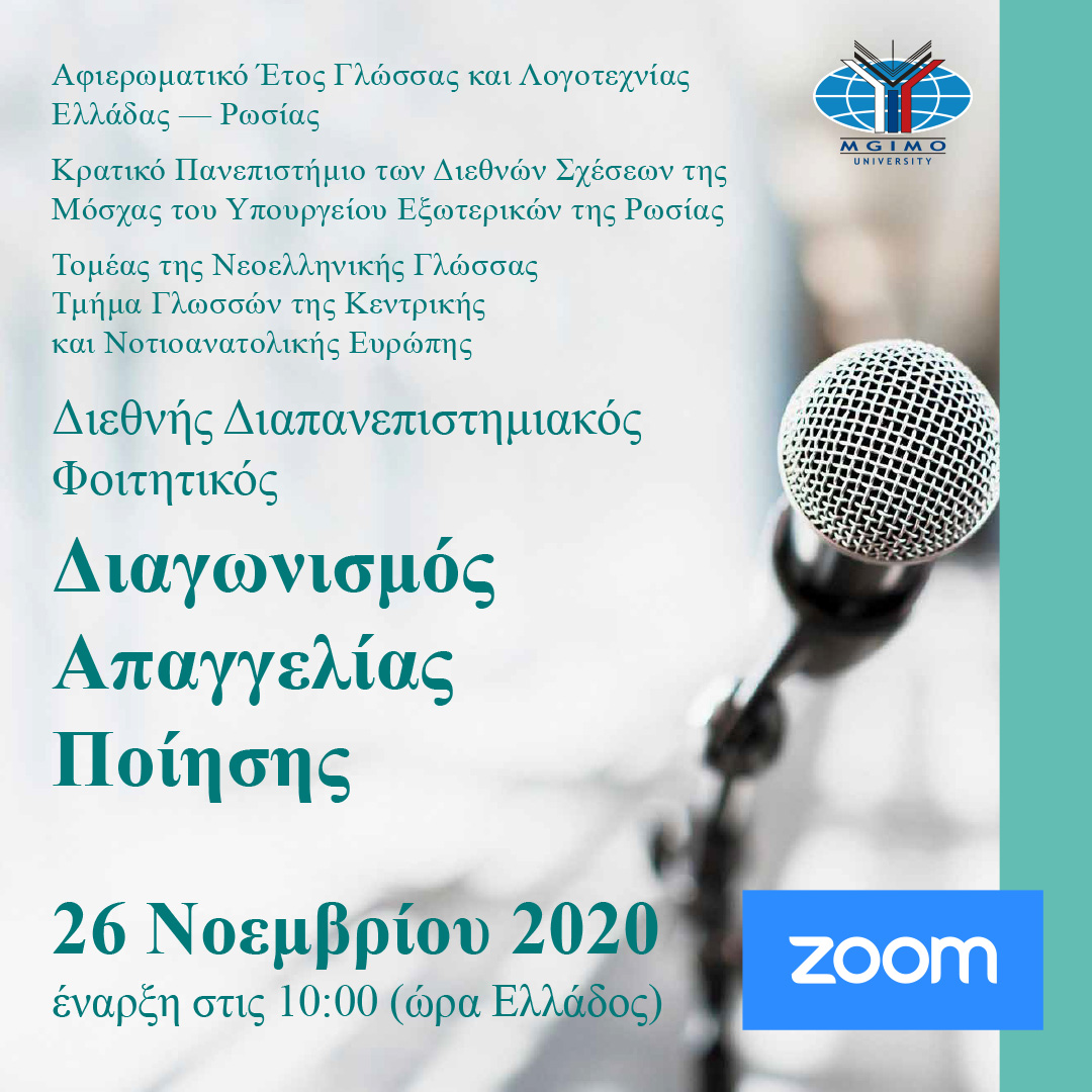Ο διαγωνισμός διοργανώθηκε στο πλαίσιο του αφιερωματικού έτους 2019-2020 Γλώσσας & Λογοτεχνίας Ελλάδας-Ρωσίας. Πραγματοποιήθηκε με μεγάλη επιτυχία την Πέμπτη 26 Νοεμβρίου 2020, διαδικτυακά, από το Τμήμα Ελληνικών Γλωσσών του Πανεπιστημίου Διεθνών Σχέσεων της Μόσχας (MGIMO), με την υποστήριξη του Προγράμματος «Ιάσων» του ΑΠΘ. Φοιτητές/φοιτήτριες από την Ελλάδα που μαθαίνουν ρωσικά απήγγειλαν ποιήματα Ρώσων ποιητών, ενώ φοιτητές/φοιτήτριες από τη Ρωσία που μελετούν ελληνικά απήγγειλαν έργα Ελλήνων ποιητών.