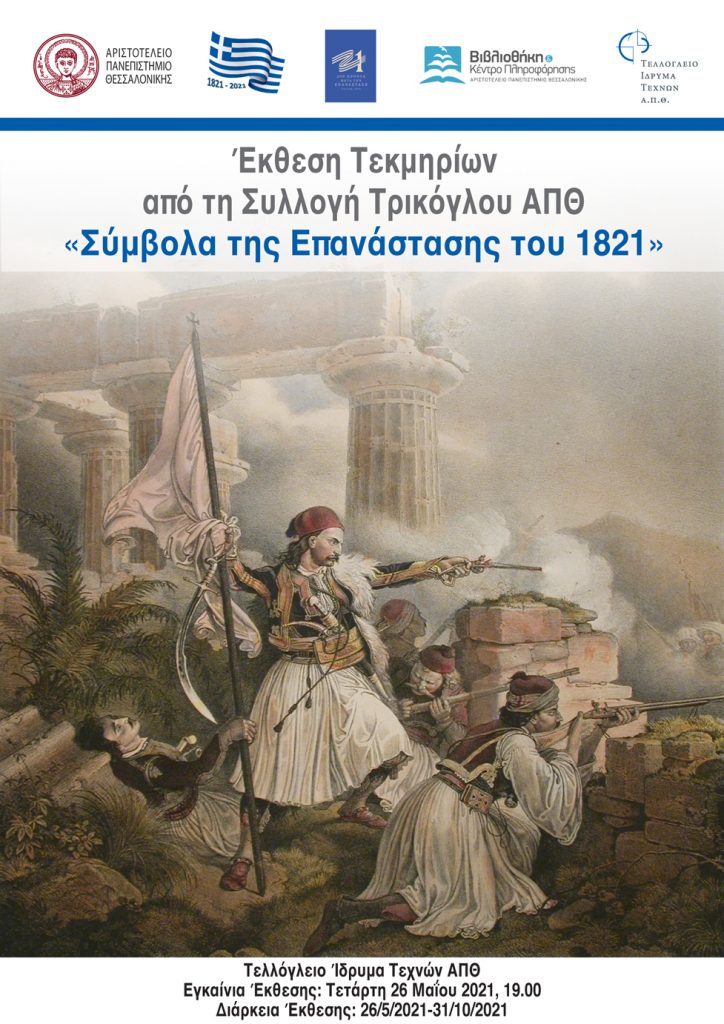 Η έκθεση «Σύμβολα της Επανάστασης του 1821» φιλοξενείται στον 2ο όροφο του Τελλόγλειου Ιδρύματος. Συνιστά συνεργασία της Επιτροπής ΑΠΘ για το 1821 με τη Βιβλιοθήκη & Κέντρο Πληροφόρησης ΑΠΘ και το Τελλόγλειο Ίδρυμα Τεχνών. Παρουσιάζει τεκμήρια από τη Συλλογή Ιωάννη Τρικόγλου, που βρίσκεται στην Κεντρική Βιβλιοθήκη του ΑΠΘ. Μέσα από 56 έργα (λιθογραφίες, επιζωγραφισμένες λιθογραφίες και χαρακτικά), που βασίζονται σε πίνακες των Peter von Hess, Karl von Krazeisen, Adam Friedel κ.ά., ξεδιπλώνονται πτυχές του Αγώνα, μέσα από τη ματιά καλλιτεχνών που έζησαν από κοντά τα γεγονότα ή γνώρισαν τους πρωταγωνιστές τους. Η σχεδιαστική δεξιοτεχνία συναντά την ιστορική αφήγηση κι ο θαυμασμός την εξιδανίκευση και τον αφηρωισμό των προσώπων, που ηγήθηκαν της Ελληνικής Επανάστασης.