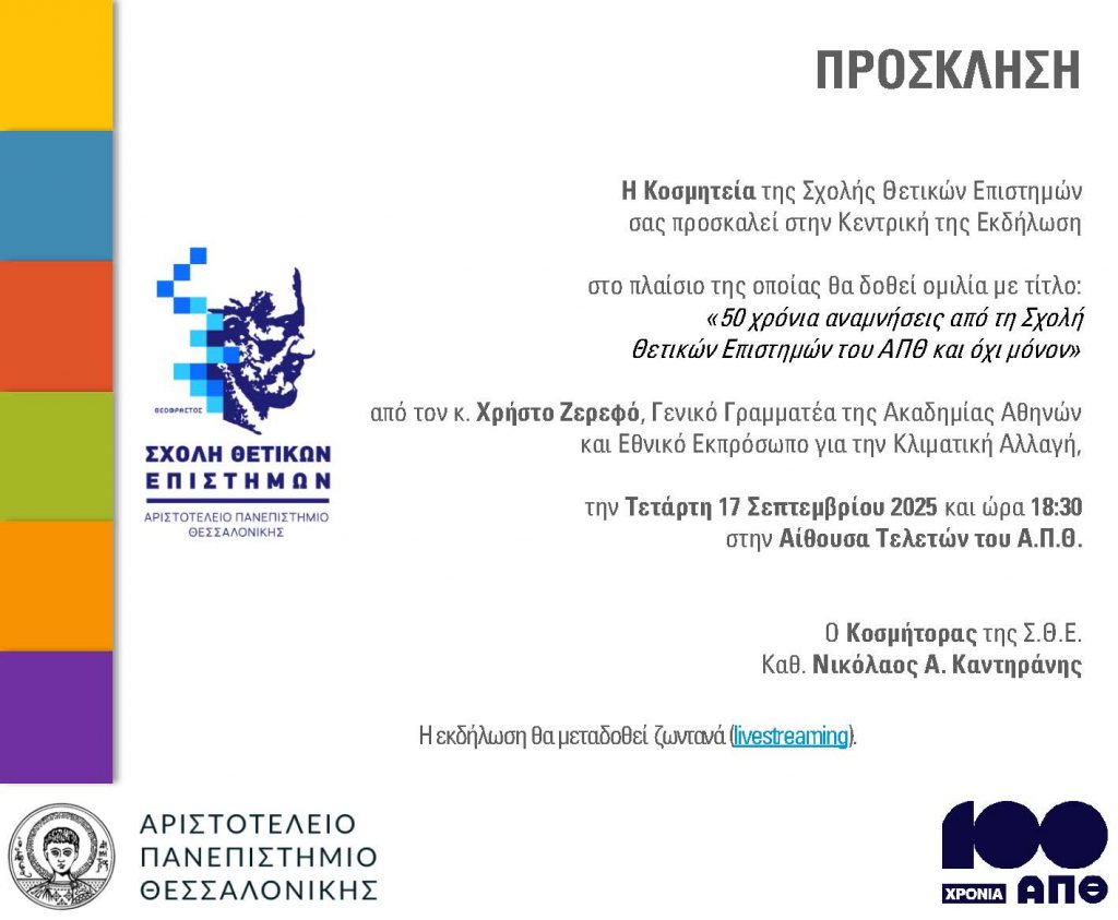 Η εκδήλωση θα μεταδοθεί ζωντανά από τον σύνδεσμο: https://www.auth.gr/events/kentriki-ekdilosi-tis-scholis-thetikon/