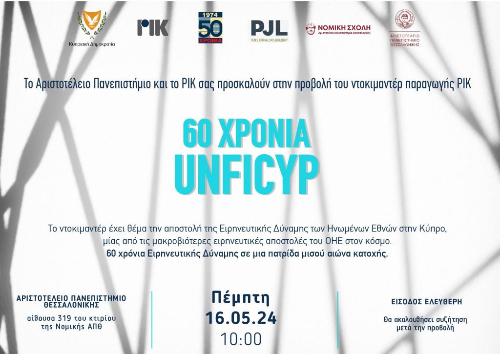 Το Τμήμα Δημοσιογραφίας και ΜΜΕ, το Εργαστήριο Ειρηνευτικής Δημοσιογραφίας του ΑΠΘ, η Νομική Σχολή του ΑΠΘ και το Ραδιοφωνικό Ίδρυμα Κύπρου διοργανώνουν εκδήλωση για την προβολή του ντοκιμαντέρ, με τίτλο «60 Χρόνια UNFICYP», την Πέμπτη 16 Μαΐου 2024 και ώρα 10:00, στη Νομική Σχολή του ΑΠΘ (Αίθουσα 319).