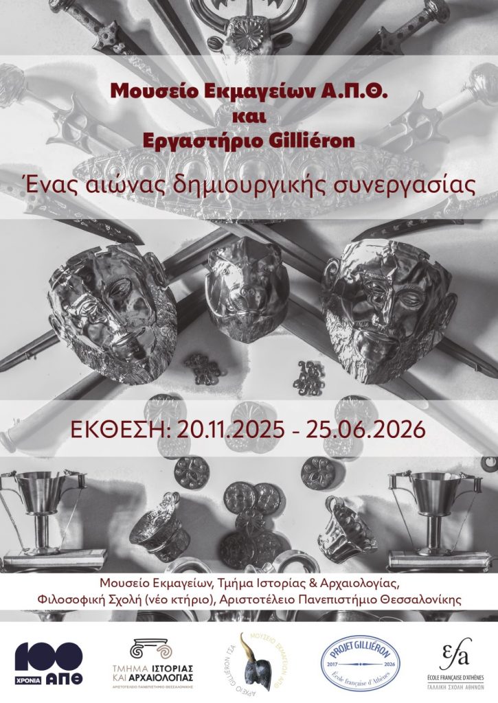 Έκθεση, με τίτλο: «Μουσείο Εκμαγείων ΑΠΘ και Εργαστήριο Gilliéron: ένας αιώνας δημιουργικής συνεργασίας», διοργανώνει το Μουσείο Εκμαγείων του Αριστοτελείου Πανεπιστημίου, στις Αίθουσες Α και Β στο υπόγειο του νέου κτιρίου της Φιλοσοφικής Σχολής. Τα εγκαίνια της Έκθεσης θα πραγματοποιηθούν την Πέμπτη 20 Νοεμβρίου 2025 και ώρα 18.00, στο Αμφιθέατρο του Μουσείου Εκμαγείων (Αίθουσα Β).