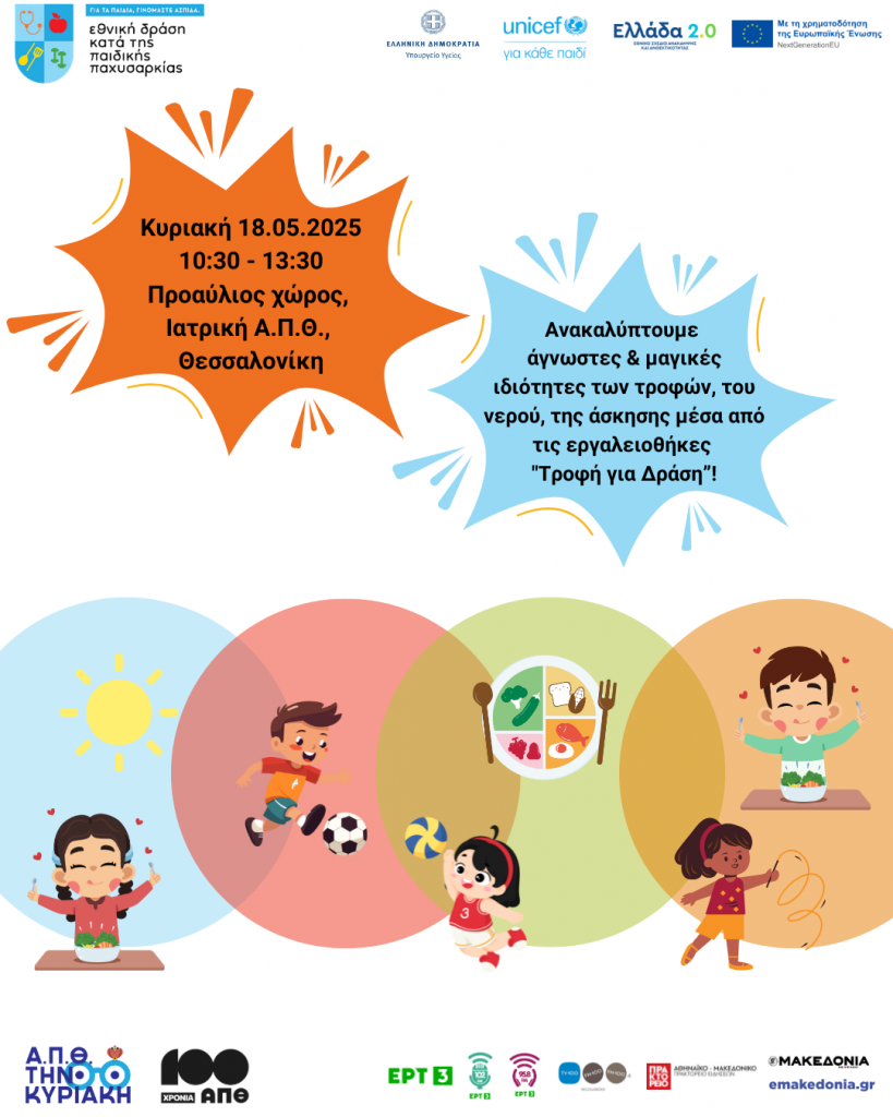 Η εκδήλωση πραγματοποιείται στο πλαίσιο της Εθνικής Δράσης για την αντιμετώπιση της παιδικής παχυσαρκίας, από τους κατ’ εξοχήν ειδικούς ακαδημαϊκούς και συνεργάτες του ΑΠΘ από το Εργαστήριο Υγιεινής, Κοινωνικής-Προληπτικής Ιατρικής και Ιατρικής Στατιστικής του Τμήματος Ιατρικής, τα Εργαστήρια «Διοίκησης Αθλητισμού, Αναψυχής και Αθλητικού Τουρισμού» και «Κοινωνικής Έρευνας στη Φυσική Δραστηριότητα» της Σχολής Επιστήμης Φυσικής Αγωγής και Αθλητισμού και το Κέντρο για τα Δικαιώματα του Παιδιού του ΑΠΘ.