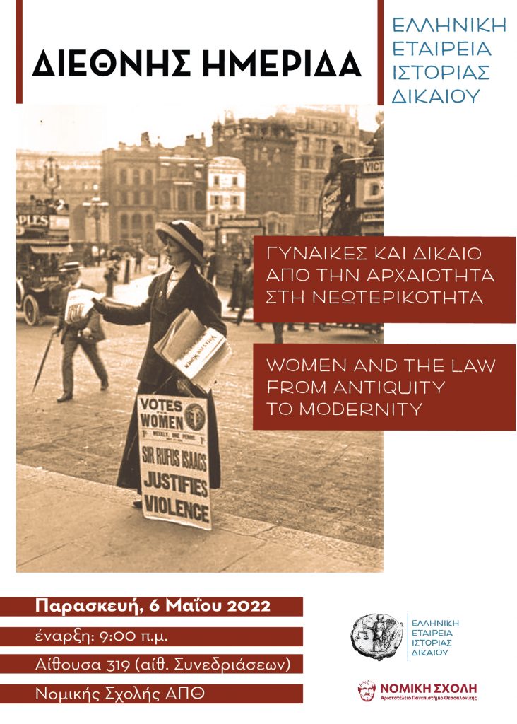 «Γυναίκες και Δίκαιο από την Αρχαιότητα στη Νεωτερικότητα» είναι το θέμα της διεθνούς Ημερίδας που διοργανώνουν η Ελληνική Εταιρεία Ιστορίας του Δικαίου και η Νομική Σχολή του ΑΠΘ, την Παρασκευή 6 Μάϊου 2022 και ώρες 9.00 με 15.30, στην Αίθουσα 319 (Αίθουσα Συνεδριάσεων) της Νομικής Σχολής του ΑΠΘ. Την εκδήλωση θα χαιρετίσει ο Κοσμήτορας της Νομικής Σχολής του ΑΠΘ, Καθηγητής Παναγιώτης Γκλαβίνης.
