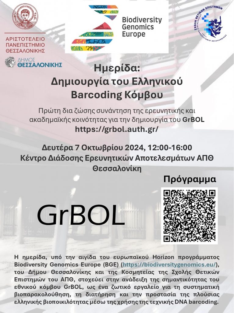 Περισσότερες πληροφορίες για το ερευνητικό πρόγραμμα BGE: https://biodiversitygenomics.eu/ και για το πρόγραμμα της Ημερίδας: https://grbol.auth.gr/%ce%b7%ce%bc%ce%b5%cf%81%ce%af%ce%b4%ce%b1/