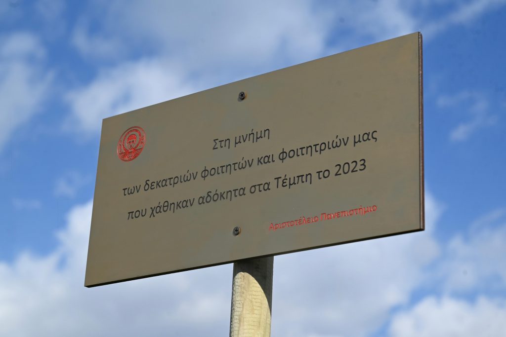 Εκατό δέντρα για τη συμπλήρωση εκατό χρόνων από τη λειτουργία του Αριστοτελείου Πανεπιστημίου. Η πρώτη αγριοκερασιά αφιερώθηκε στη μνήμη των φοιτητών και φοιτητριών θυμάτων των Τεμπών