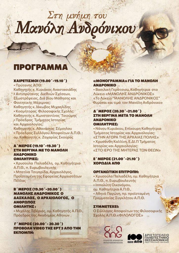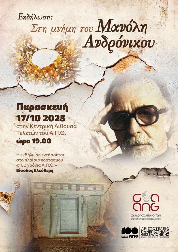 Εκδήλωση στη μνήμη του Μανόλη Ανδρόνικου διοργανώνει ο Σύλλογος Αποφοίτων του Αριστοτελείου Πανεπιστημίου, την Παρασκευή 17 Οκτωβρίου 2025 και ώρα 19.00, στην Αίθουσα Τελετών.