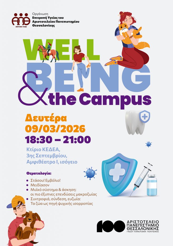 Ενημερωτική εκδήλωση, με τίτλο «WELLBEING & the Campus», διοργανώνεται από την Επιτροπή Υγείας του Αριστοτελείου Πανεπιστημίου, τη Δευτέρα 9 Μαρτίου και ώρα 18:30, στο Αμφιθέατρο Ι του ΚΕΔΕΑ.