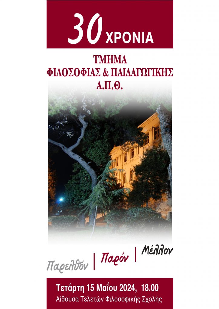Με αφορμή τη συμπλήρωση 30 χρόνων από την ίδρυσή του, το Τμήμα Φιλοσοφίας και Παιδαγωγικής της Φιλοσοφικής Σχολής του ΑΠΘ διοργανώνει επετειακή εκδήλωση, την Τετάρτη 15 Μαΐου 2024 και ώρα 18:00, στην Αίθουσα Τελετών του παλαιού κτιρίου της Φιλοσοφικής Σχολής του ΑΠΘ.