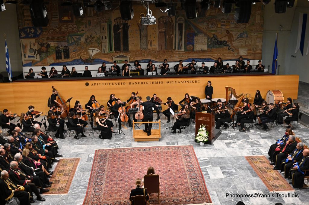 Η Τελετή ξεκίνησε με το Απολυτίκιο του Αγίου Δημητρίου από τη Χορωδία «Γιάννης Μάντακας» του ΑΠΘ, υπό τη διεύθυνση της Εριφύλης Δαμιανού. Στο μουσικό μέρος της εκδήλωσης, η Συμφωνική Ορχήστρα του ΑΠΘ ερμήνευσε το έργο «Επικό τραγούδι» του Θεόδωρου Καρυωτάκη και συνέπραξε με τη Χορωδία «Γιάννης Μάντακας» και το Χορωδιακό Εργαστήρι του Τμήματος Μουσικών Σπουδών του ΑΠΘ σε διδασκαλία Εριφύλης Δαμιανού, στο έργο του John Williams, «Ύμνος στους πεσόντες» από την ταινία «Η διάσωση του στρατιώτη Ράιαν». Τη Συμφωνική Ορχήστρα και τις χορωδίες του Αριστοτέλειου Πανεπιστημίου Θεσσαλονίκης διεύθυνε ο Επίκ. Καθηγητής του Τμήματος Μουσικών Σπουδών του ΑΠΘ, Βλαδίμηρος Συμεωνίδης.