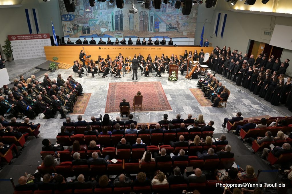Η τελετή ξεκίνησε με το Απολυτίκιο του Αγίου Δημητρίου από τη Χορωδία «Γιάννης Μάντακας» του ΑΠΘ, υπό τη διεύθυνση της Εριφύλης Δαμιανού. Στο μουσικό μέρος της εκδήλωσης, η Συμφωνική Ορχήστρα του ΑΠΘ ερμήνευσε το «Ηρωϊκό εμβατήριο» από την 1η Ελληνική Σουίτα του Διονύσιου Λαυράγκα και τους τρεις ελληνικούς χορούς του Θοδωρή Παπαδημητρίου, ενώ η Χορωδία «Γιάννης Μάντακας» σε διεύθυνση της Εριφύλης Δαμιανού, παρουσίασε το τραγούδι «Με το λύχνο του άστρου» από το ορατόριο «Άξιον Εστί» του Μίκη Θεοδωράκη. Τη Συμφωνική Ορχήστρα και τις χορωδίες του ΑΠΘ διεύθυνε ο Επίκ. Καθηγητής του Τμήματος Κινηματογράφου, Θοδωρής Παπαδημητρίου.