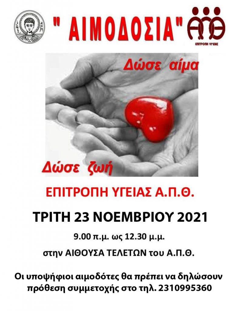 Εθελοντική αιμοδοσία διοργανώνει η Επιτροπή Υγείας του ΑΠΘ, την Τρίτη 23 Νοεμβρίου 2021, και ώρες 9:00 με 12:30, στο φουαγιέ του κτιρίου Διοίκησης του ΑΠΘ.