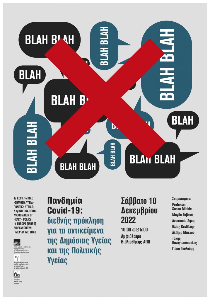 «Πανδημία COVID-19: διεθνής πρόκληση για τα αντικείμενα της Δημόσιας Υγείας και της Πολιτικής Υγείας» είναι το θέμα της Ημερίδας, η οποία θα πραγματοποιηθεί το Σάββατο 10 Δεκεμβρίου 2022 και ώρες 10:00 με 15:00, στο Αμφιθέατρο της Κεντρικής Βιβλιοθήκης του ΑΠΘ.