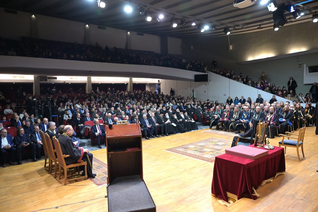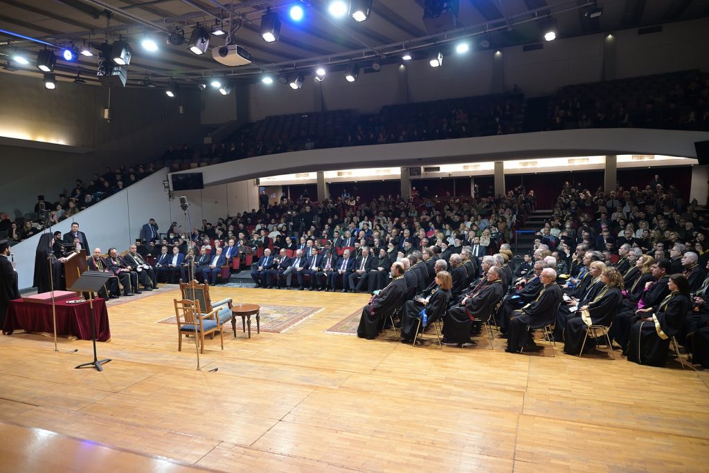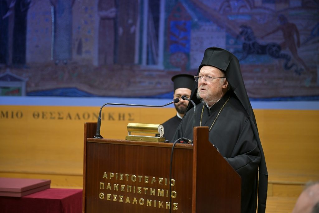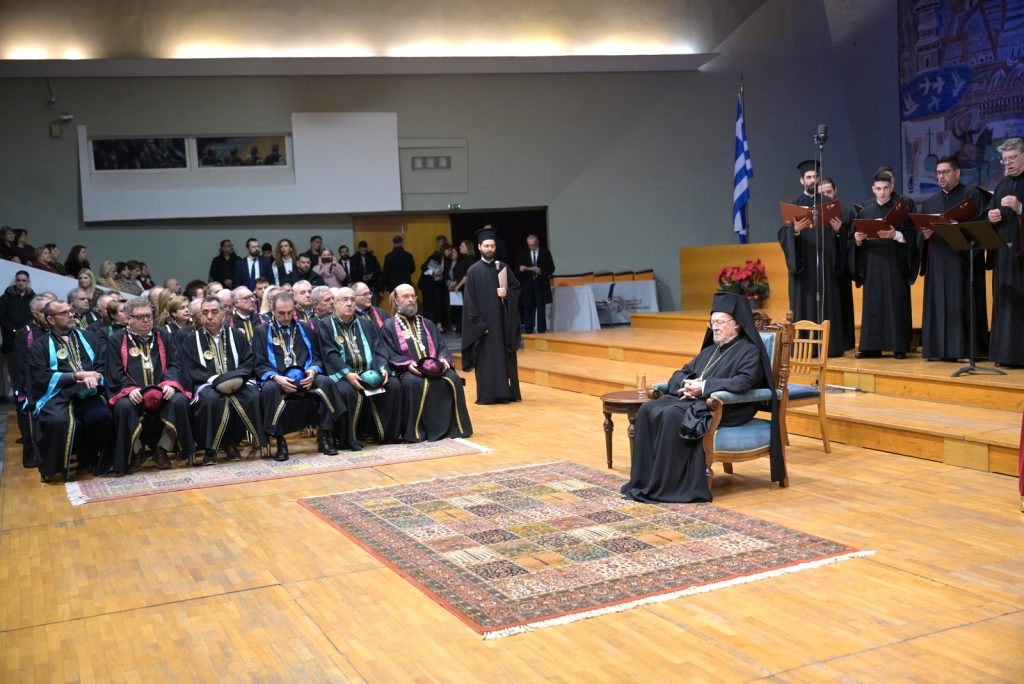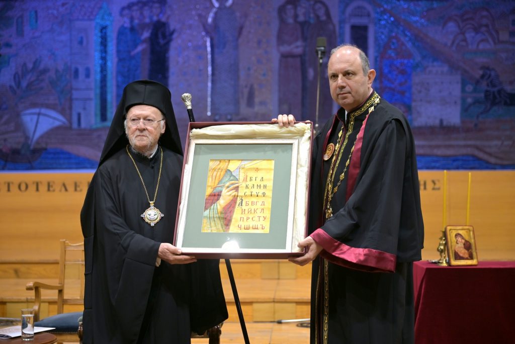 Ύστερα από την εισήγηση του Πρύτανη του Αριστοτελείου Πανεπιστημίου, Καθηγητή Κυριάκου Αναστασιάδη, τον πανηγυρικό λόγο της ημέρας εκφώνησε η Αυτού Θειοτάτη Παναγιότης, ο Αρχιεπίσκοπος Κωνσταντινουπόλεως, Νέας Ρώμης και Οικουμενικός Πατριάρχης κ.κ. Βαρθολομαίος Α΄.