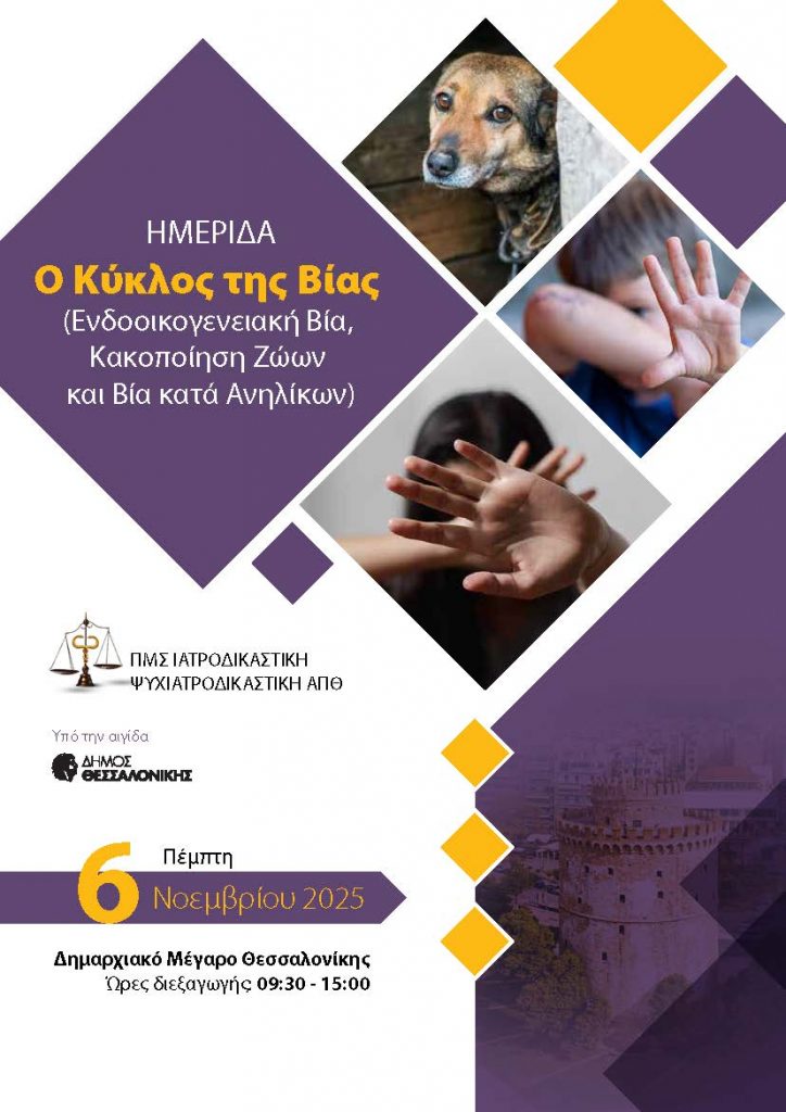 Με στόχο την ανάδειξη των πολλαπλών εκφάνσεων της βίας και των τρόπων πρόληψης και αντιμετώπισής της, το Πρόγραμμα Μεταπτυχιακών Σπουδών «Ιατροδικαστική-Ψυχιατροδικαστική» του Αριστοτελείου Πανεπιστημίου, σε συνεργασία με τον Δήμο Θεσσαλονίκης, διοργανώνει επιστημονική Ημερίδα, με τίτλο «Ο Κύκλος της Βίας (Ενδοοικογενειακή Βία, Κακοποίηση Ζώων και Βία κατά Ανηλίκων)», την Πέμπτη 6 Νοεμβρίου 2025 και ώρες 9.30 με 15.00, στο Δημαρχιακό Μέγαρο Θεσσαλονίκης (Αίθουσα Δημοτικού Συμβουλίου).