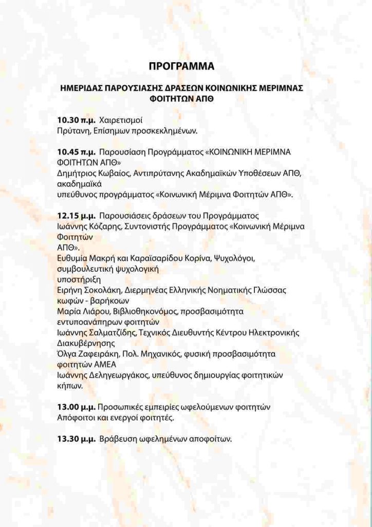 Στην εκδήλωση θα παρουσιαστεί το έργο «Κοινωνική Μέριμνα Φοιτητών ΑΠΘ» το οποίο υλοποιείται με τη συντονισμένη υποστήριξη των Πρυτανικών Αρχών του ΑΠΘ και των Σχολών, Τμημάτων και μονάδων του ιδρύματος. Υπεύθυνος του έργου είναι ο Αντιπρύτανης Ακαδημαϊκών Υποθέσεων και Φοιτητικής Μέριμνας του ΑΠΘ, Καθηγητής Δημήτριος Κωβαίος.