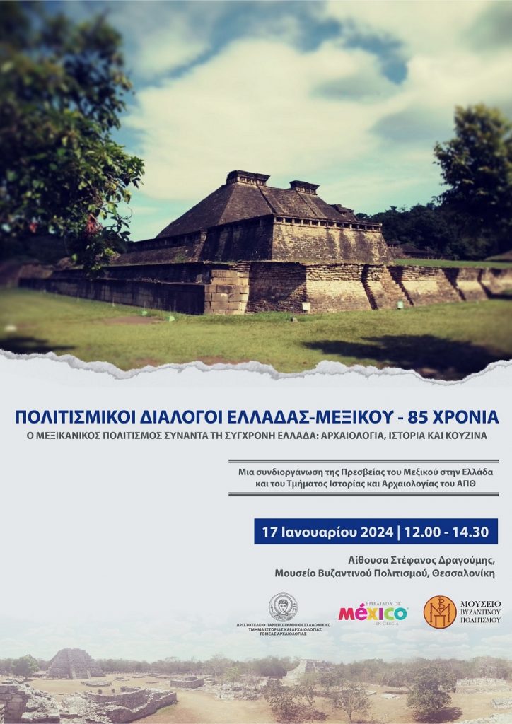 Το Τμήμα Ιστορίας και Αρχαιολογίας του ΑΠΘ και η Πρεσβεία του Μεξικού στην Αθήνα συνδιοργανώνουν την Ημερίδα, με τίτλο «Ο πολιτισμός του Μεξικού συναντά τη Σύγχρονη Ελλάδα: Αρχαιολογία, Ιστορία, Τέχνη και Διατροφή», την Τετάρτη 17 Ιανουαρίου 2024 και ώρες 12.00 με 14.30, στο Μουσείο Βυζαντινού Πολιτισμού (Αίθουσα Στέφανος Δραγούμης), στη Θεσσαλονίκη.