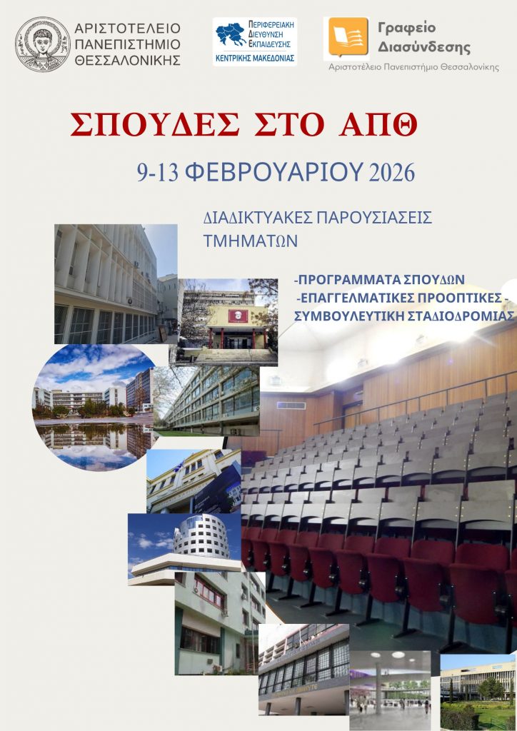 Το Γραφείο Διασύνδεσης Σπουδών και Σταδιοδρομίας του Αριστοτελείου Πανεπιστημίου, σε συνεργασία με την Περιφερειακή Διεύθυνση Α/θμιας και Β/θμιας Εκπαίδευσης Κεντρικής Μακεδονίας, διοργανώνουν πενθήμερη εκδήλωση, με θέμα: «Σπουδές στο Αριστοτέλειο Πανεπιστήμιο Θεσσαλονίκης». Η εκδήλωση θα πραγματοποιηθεί διαδικτυακά, από τη Δευτέρα 9 έως και την Παρασκευή 13 Φεβρουαρίου 2026, και ώρες 9:00 με 14:30.