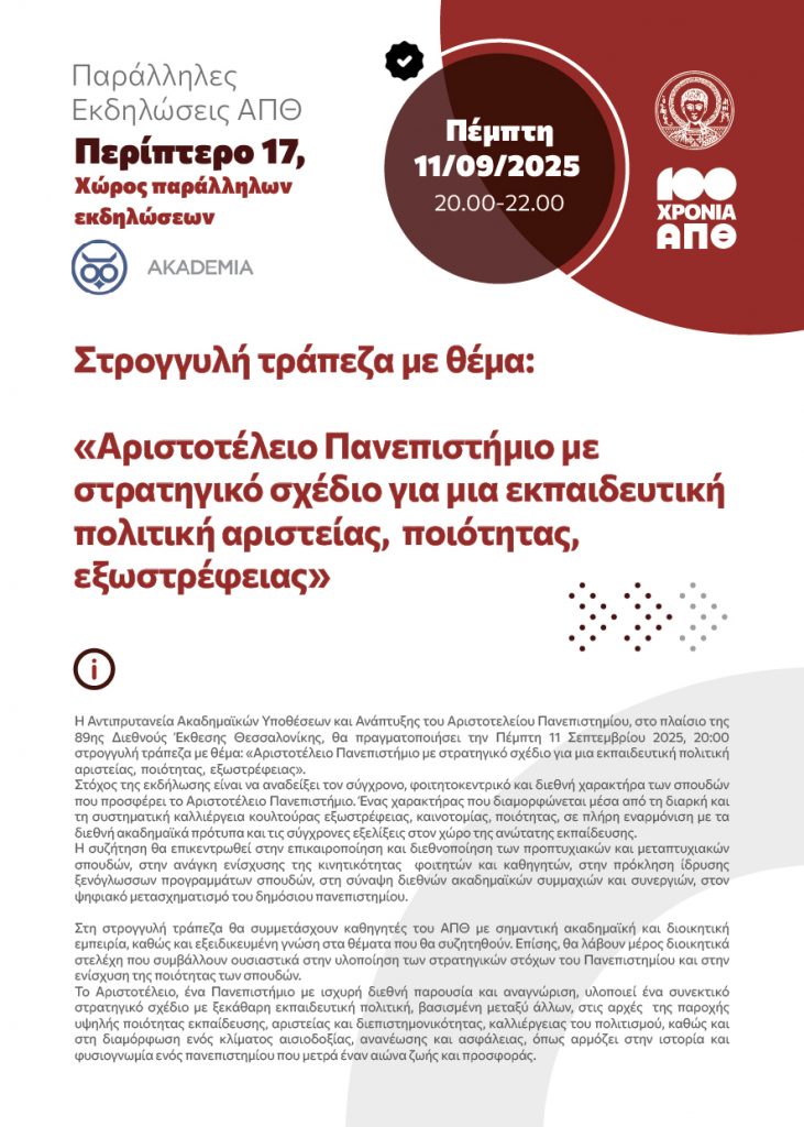 «Αριστοτέλειο Πανεπιστήμιο με στρατηγικό σχέδιο για μια εκπαιδευτική πολιτική αριστείας, ποιότητας, εξωστρέφειας» είναι το θέμα της στρογγυλής τράπεζας που διοργανώνει η Αντιπρυτανεία Ακαδημαϊκών Υποθέσεων και Ανάπτυξης του ΑΠΘ, στο πλαίσιο της 89ης Διεθνούς Έκθεσης Θεσσαλονίκης, την Πέμπτη 11 Σεπτεμβρίου 2025 και ώρα 20:00.
