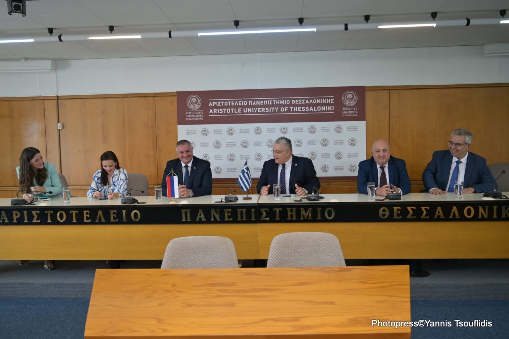 Η επικεφαλής της αντιπροσωπείας της Σερβικής Δημοκρατίας της Βοσνίας-Ερζεγοβίνης στην Ελλάδα, Jelena Jonanovic, η Πρέσβειρα της Βοσνίας-Ερζεγοβίνης στην Αθήνα, Milica Ristović Krstić, ο Πρωθυπουργός της Σερβικής Δημοκρατίας της Βοσνίας-Ερζεγοβίνης, Radovan Višković, ο Πρύτανης του ΑΠΘ, Καθηγητής Νικόλαος Γ. Παπαϊωάννου, ο Αντιπρύτανης Οικονομικών, Προγραμματισμού και Ανάπτυξης, Καθηγητής Χαράλαμπος Φείδας και ο Αντιπρύτανης Ακαδημαϊκών Υποθέσεων και Φοιτητικής Μέριμνας, Καθηγητής Δημήτριος Κωβαίος.