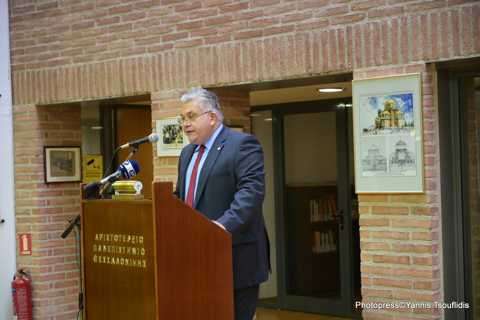 Ο Πρύτανης του ΑΠΘ αναφέρθηκε στη σχέση του Ντίνου Χριστιανόπουλου με το Αριστοτέλειο Πανεπιστήμιο Θεσσαλονίκης, η οποία ήταν κάθε άλλο παρά ευκαιριακή. «Σπούδασε στο Τμήμα Φιλολογίας και είναι τιμή για το Πανεπιστήμιό μας το γεγονός ότι μία από τις ελάχιστες διακρίσεις που αποδέχθηκε στη μακρόχρονη πορεία του ήταν ότι αναγορεύτηκε Επίτιμος Διδάκτορας του Τμήματος. Ίσως αυτό, έστω και λίγο, να εξηγεί τον λόγο για τον οποίο βρισκόμαστε σήμερα εδώ» επισήμανε ο Πρύτανης.