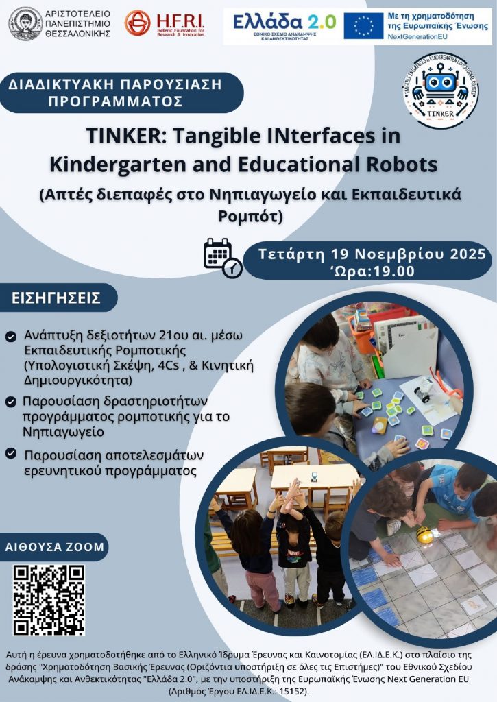 «Απτές διεπαφές στο Νηπιαγωγείο και Εκπαιδευτικά Ρομπότ» («TINKER: Tangible INterfaces in Kindergarten and Educational Robots») είναι ο τίτλος του ερευνητικού προγράμματος, το οποίο θα παρουσιάσει διαδικτυακά η ερευνητική ομάδα υπό την επίβλεψη του Αν. Καθηγητή του Τμήματος Φιλοσοφίας και Παιδαγωγικής του Αριστοτελείου Πανεπιστημίου Θεοδόσιου Σαπουνίδη, την Τετάρτη 19 Νοεμβρίου 2025 και ώρα 19.00.