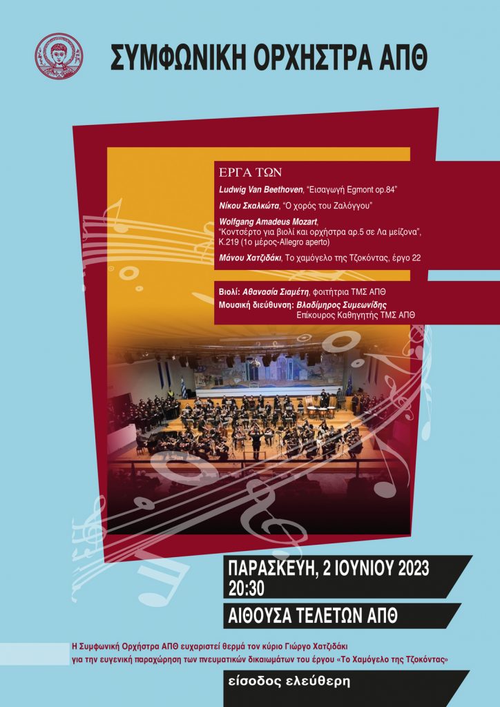 Το Χαμόγελο της Τζοκόντας του Μάνου Χατζιδάκι θα παρουσιάσει η Συμφωνική Ορχήστρα του Αριστοτέλειου Πανεπιστημίου, υπό τη μουσική διεύθυνση του Επίκ. Καθηγητή του Τμήματος Μουσικών Σπουδών του ΑΠΘ Βλαδίμηρου Συμεωνίδη, την Παρασκευή 2 Ιουνίου 2023 και ώρα 20:30, στην Αίθουσα Τελετών του ΑΠΘ.