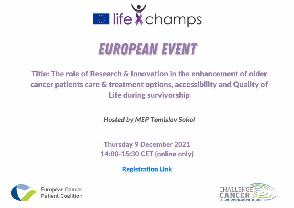 Το Ευρωπαϊκό Κοινοβούλιο υποδέχεται, την Πέμπτη 9 Δεκεμβρίου 2021, το ερευνητικό πρόγραμμα LifeChamps (H2020), σε έναν «διαδικτυακό» διάλογο για τον ρόλο της έρευνας και της ψηφιακής καινοτομίας στην περίθαλψη ογκολογικών ασθενών μεγαλύτερης ηλικίας.