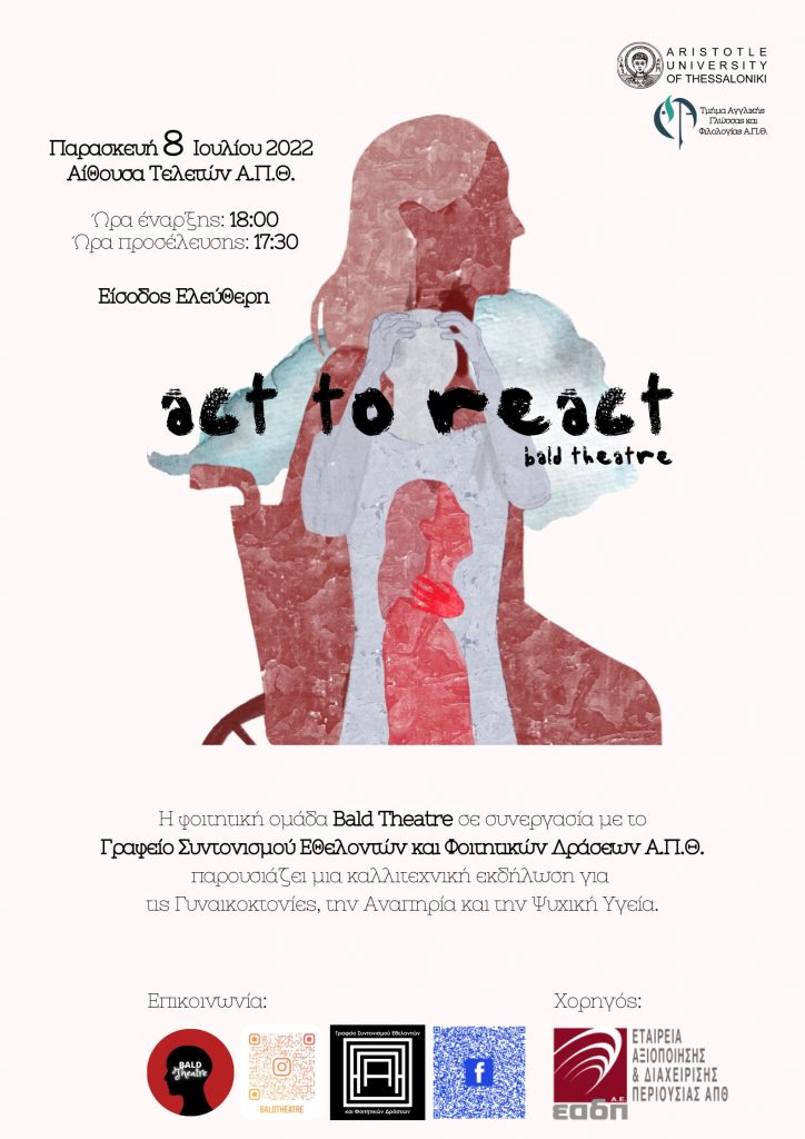 Το BALD THEATRE είναι η καλλιτεχνική ομάδα του Τμήματος Αγγλικής Γλώσσας και Φιλολογίας του ΑΠΘ. Δημιουργήθηκε το 1984 και ανασυστάθηκε το 2021 από τρεις απόφοιτες του Τμήματος. Η εκδήλωση αποτελεί μία ιδέα των συντονιστριών και υπεύθυνων της φοιτητικής καλλιτεχνικής ομάδας BALD THEATRE του Τμήματος Αγγλικής Γλώσσας και Φιλολογίας του ΑΠΘ, Βάσιας Βασίλογλου, Ελένης-Χριστίνας Γεωργιάδου και Φωτεινής Τσακίρη.