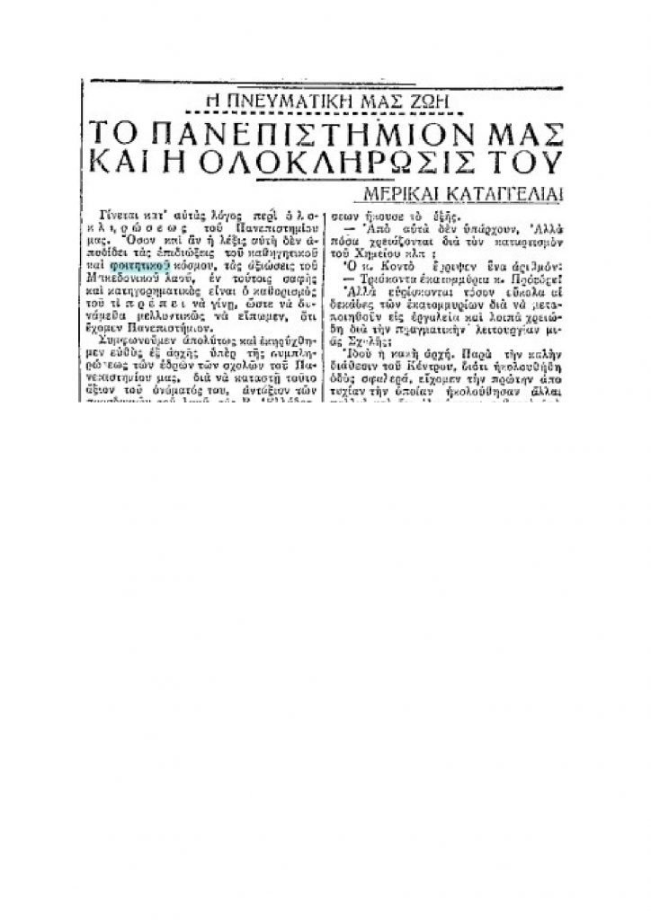 «… Ιδιαιτέρως δε θα φροντίσωμεν διά την εκπαιδευτικήν οργάνωσιν των βορείων του κράτους επαρχιών, ενισχύοντες παντοιοτρόπως το διδακτικόν προσωπικόν και ιδρύοντες τα κατάλληλα πρακτικά προπάντων σχολεία, έτι δε και δεύτερον πανεπιστήμιον εν Θεσσαλονίκη περιλαμβάνον και τας πρακτικάς επιστήμας και μέλλον να λειτουργήση βαθμιαίως. Του πανεπιστημίου τούτου η καλή οργάνωσις και τας νέας χώρας θα ωφελήση και την επιστημονικήν παρ’ ημίν δράσιν θα προαγάγη συντελούσα εμμέσως εις την βελτίωσιν του εν Αθήναις Πανεπιστημίου» (Δ΄ Συντακτική Συνέλευση, 24 Μαρτίου 1924)
