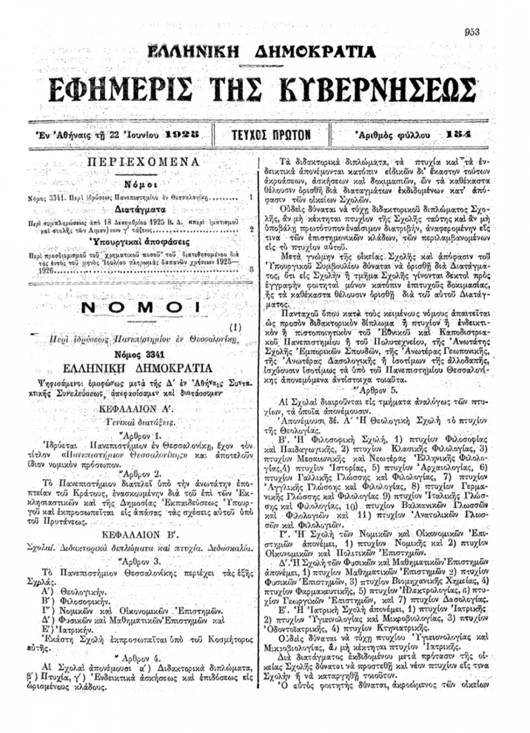 Ο ιδρυτικός νόμος του Πανεπιστημίου Θεσσαλονίκης (ν. 3341/14-6-25), με πρωτοβουλία της κυβέρνησης Αλεξ. Παπαναστασίου, ψηφίστηκε στις 5 Ιουνίου 1925 έπειτα από πολλές και μακρές συζητήσεις και δημοσιεύθηκε στο φύλλο Εφημερίδας της Κυβερνήσεως στις 22 Ιουνίου 1925. Ορκωμοσία των πρώτων καθηγητών της Φιλοσοφικής Σχολής. Όμως λόγω των πολιτικών και κοινωνικών αναταράξεων της εποχής, υπήρξαν καθυστερήσεις στην εφαρμογή του νόμου.
