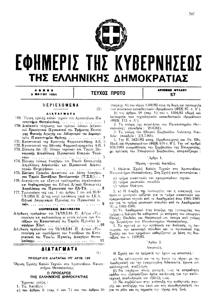 Ίδρυση των Τμημάτων Εικαστικών και Εφαρμοσμένων Τεχνών και του Τμήματος Θεάτρου της Σχολής Καλών Τεχνών.