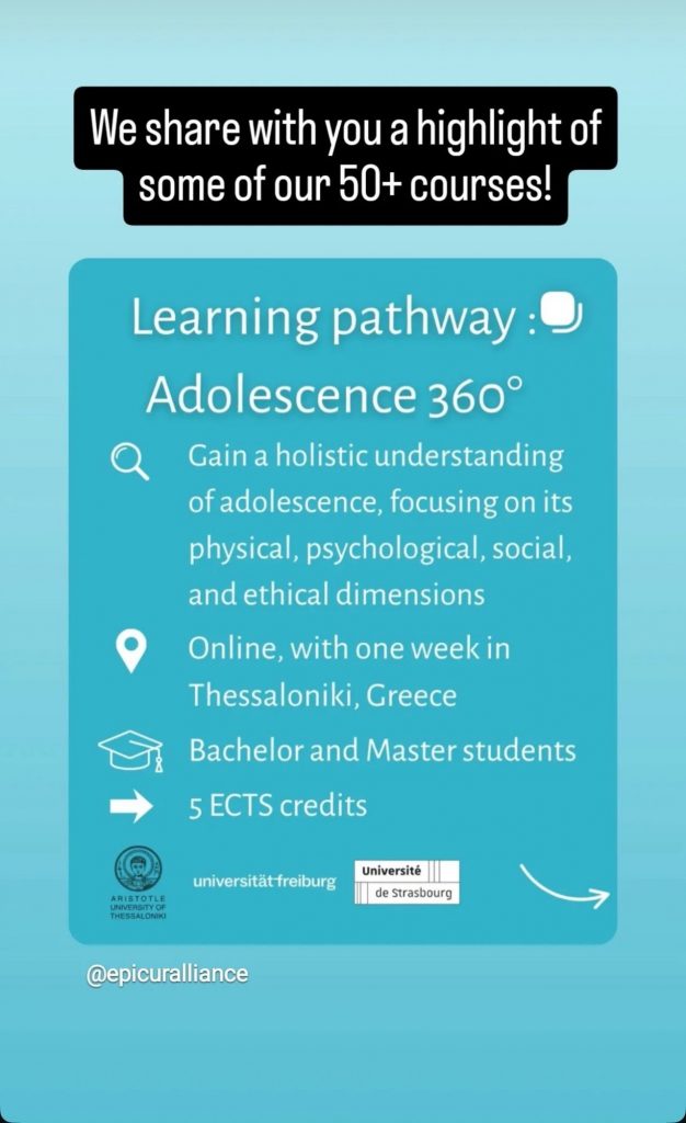Το μάθημα “Adolescence 360o“ προσφέρεται στο πλαίσιο της Ευρωπαϊκής Συμμαχίας EPICUR, είναι διεπιστημονικό (adolescent health, development, learning, immigrants, well-being) και διαπανεπιστημιακό (Α.Π.Θ., Πανεπιστήμιο Στρασβούργου και Πανεπιστήμιο Freiburg) και θα διεξαχθεί στην αγγλική γλώσσα.