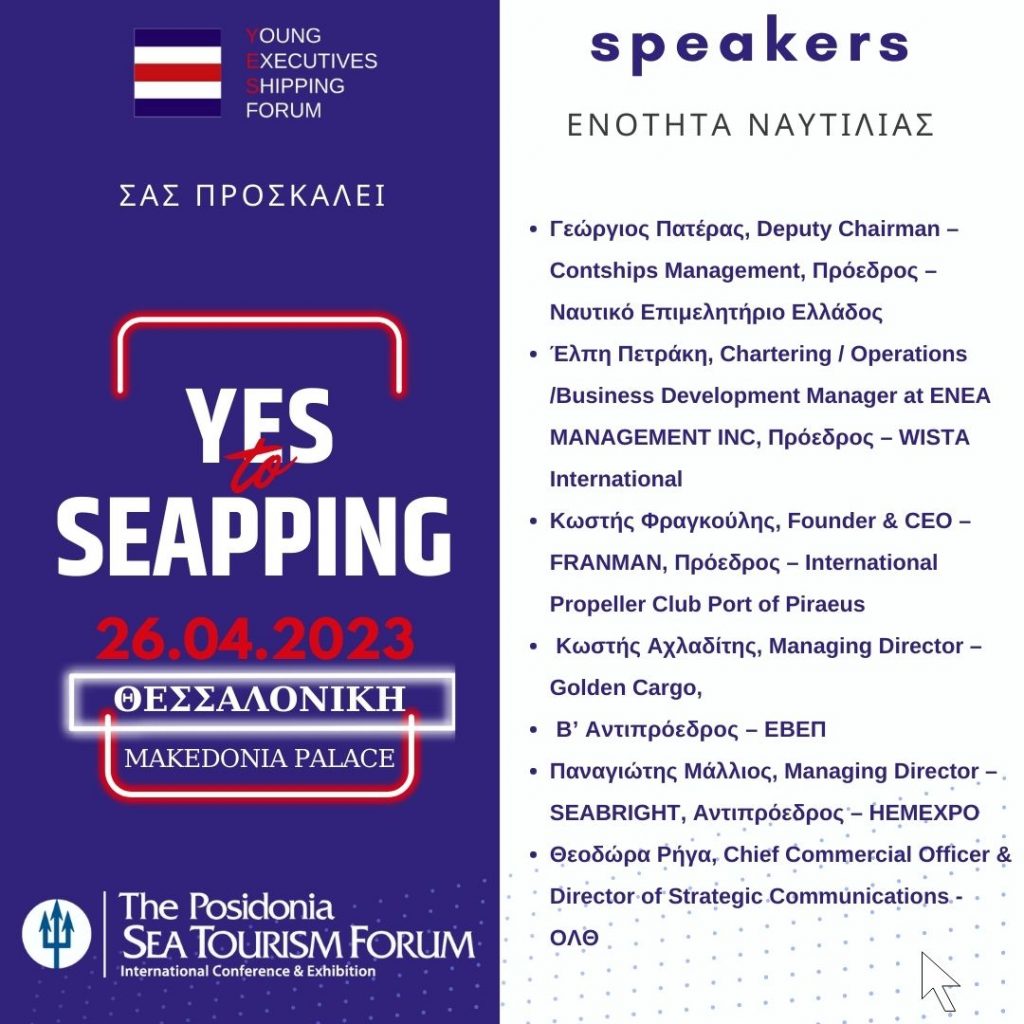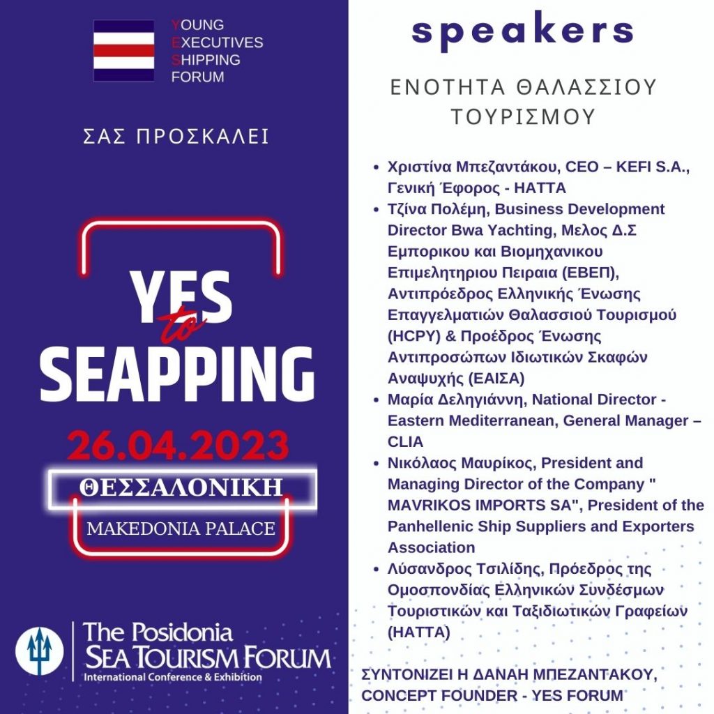 Το YES Forum διοργανώνει το «YES to SEApping Forum 2023», το οποίο θα πραγματοποιηθεί την Τετάρτη 26 Απριλίου 2023 στο πλαίσιο του Posidonia SEA Tourism 2023 στη Θεσσαλονίκη, στο MAKEDONIA PALACE. Το «YES to SEApping Forum 2023» στοχεύει στην ενημέρωση των νέων για την εξελισσόμενη Γαλάζια Οικονομία καλύπτοντας τόσο το φάσμα της Ναυτιλίας όσο και του θαλάσσιου Τουρισμού, δύο κλάδους με καθοριστική σημασία για την οικονομία και ανάπτυξη της Χώρας μας.